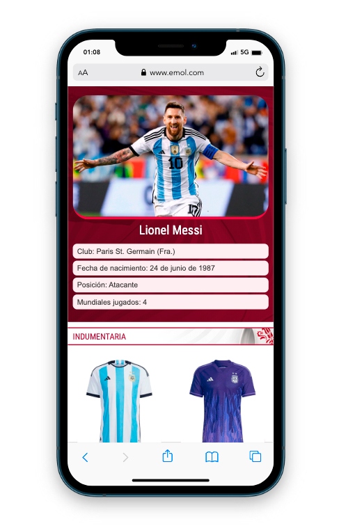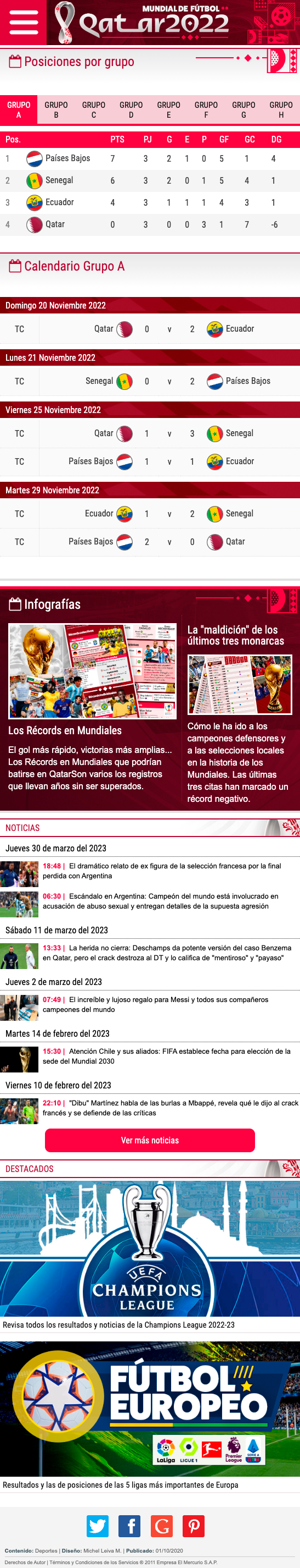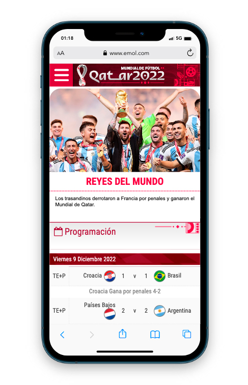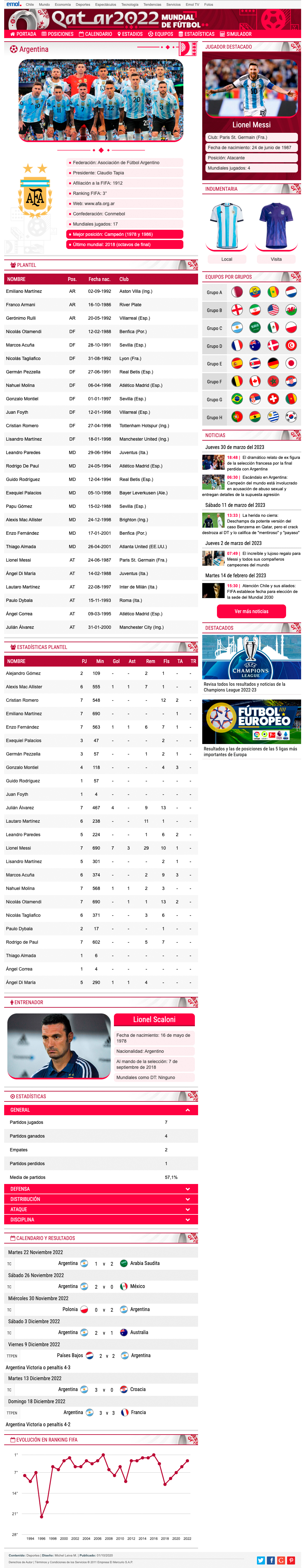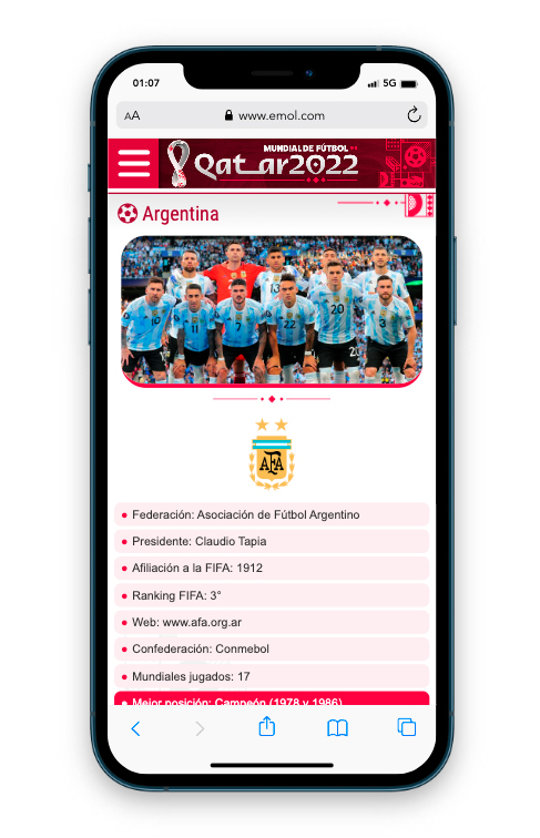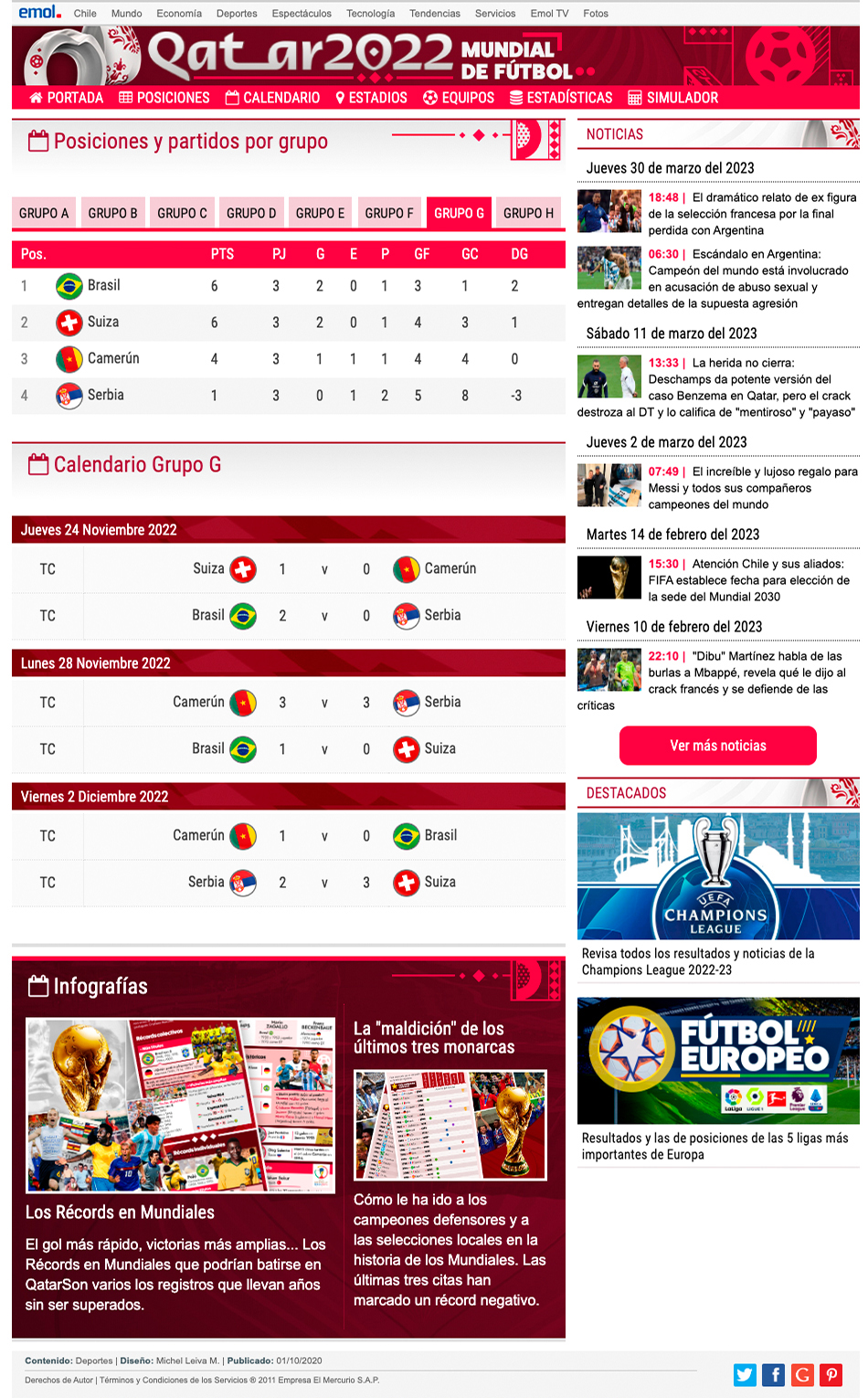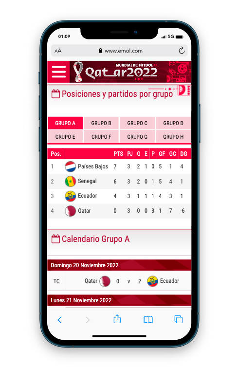 Máximo evento del fútbol mundial. En este especial contiene un calendario con toda la programación de las fechas, tabla de posiciones por grupos, estadísticas completas de cada plantel, tales como jugadores, rendimiento general, camiseta de recambio, director técnico, datos de la defensa y ataque, todo esto actualizada al instante, todo esto gracias a Widgets proporcionados por OPTA (Empresa especializada en esutdios y estadísticas). El diseño es responsive y tiene las reglas dadas por Emol, como por ejemplo debe estar alineado a la izquierda y mantener el header corporativo. Diseño fácil de editar por periodistas. En este proyecto también se hicieron algunas gráficas para el programa especial de EmolTV y infografías para notas de Emol. Visita el proyecto Mundial de Qatar 2022