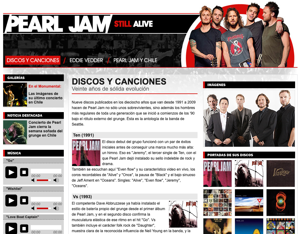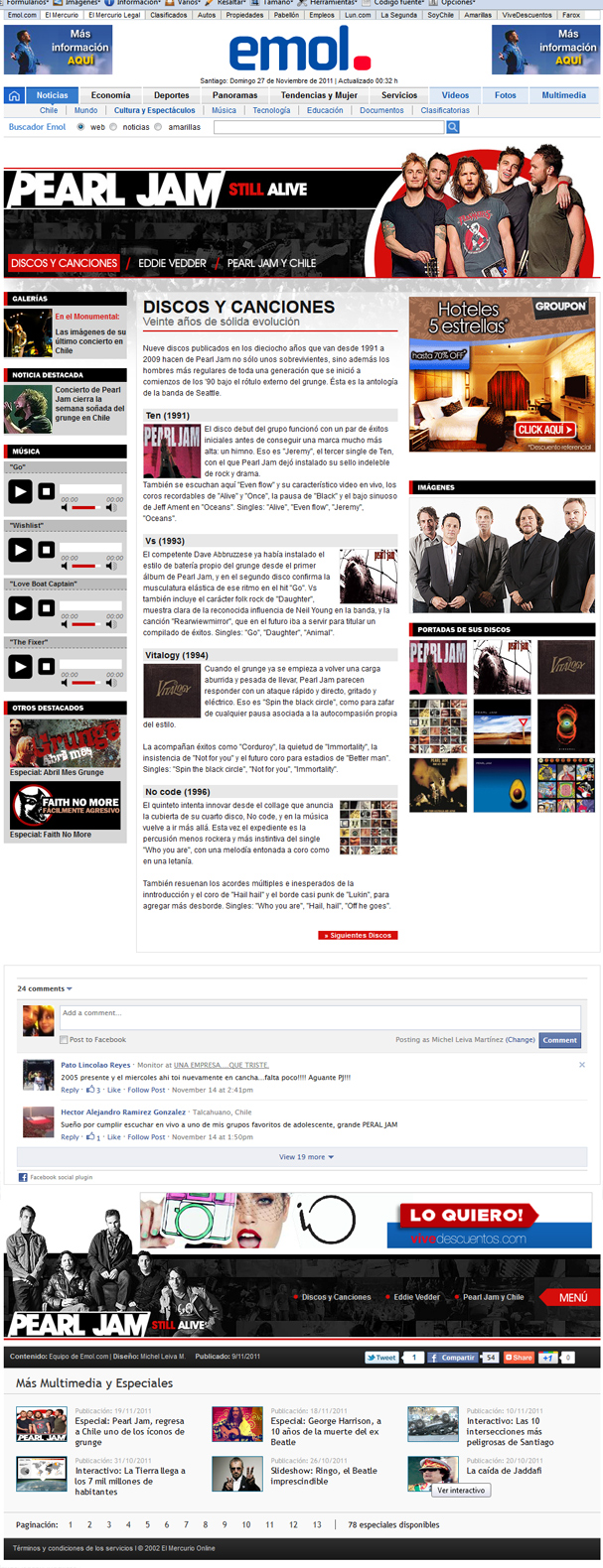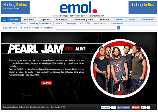 Trabajo realizado para Emol.com con requerimientos específicos como parte de la identidad gráfica que mantiene el sitio web Emol.com. En este caso fue diferente eso sí en la creatividad del diseño, ya que los especiales de Emol.com son en estructuras diferentes a los Especiales temáticos. En este caso también se tuvo que crear un estilo gráfico y un «logo» irreal al de la banda para hacer más «familiar» a la banda con lo que es Emol.com.
